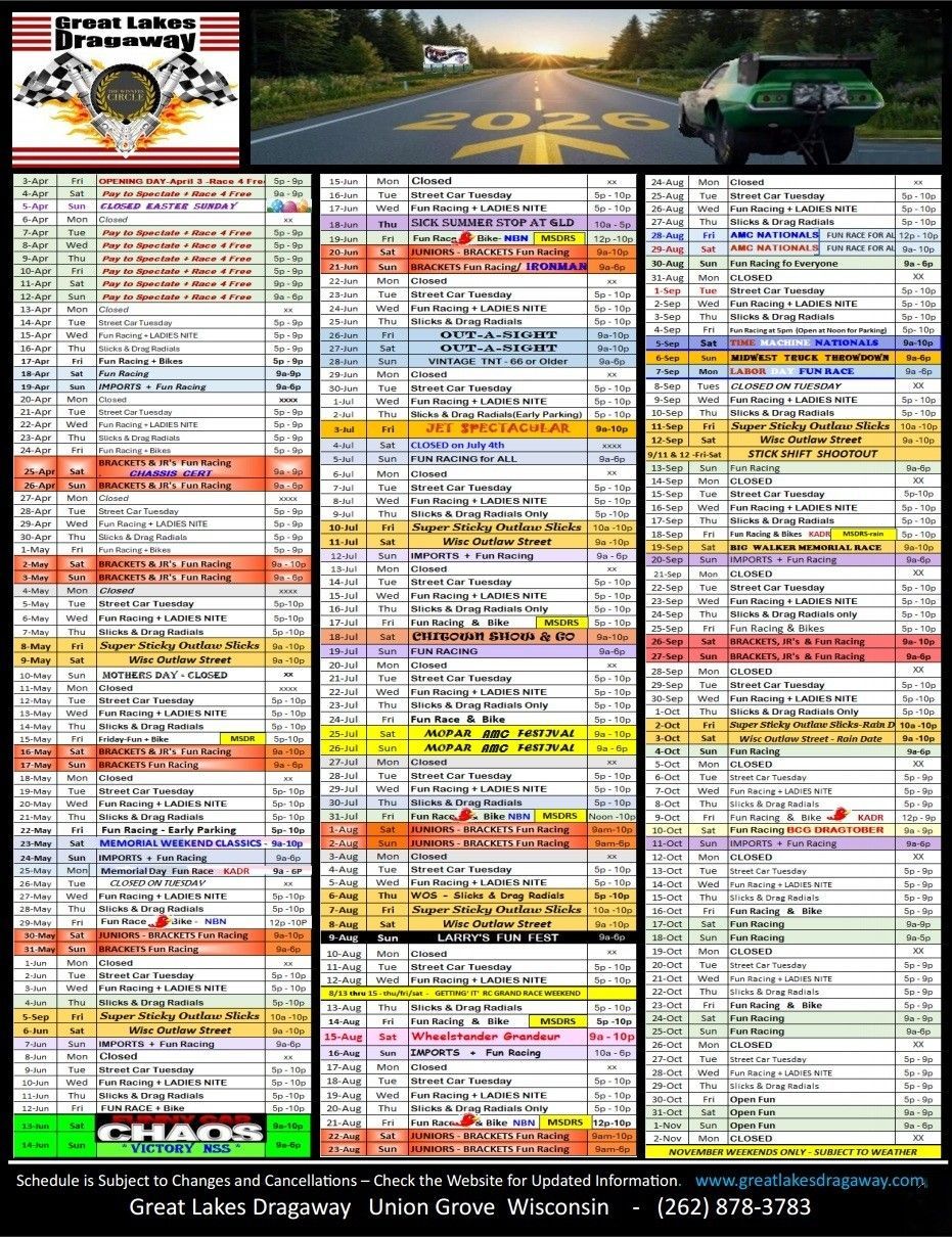 Attention, all gearheads! Great Lakes Dragaway provides track rentals for private events! This service is designed for inviting or sponsoring an outing for friends, clients, employees, corporate/manufacturer use, testing, and more! Call us today for more information.