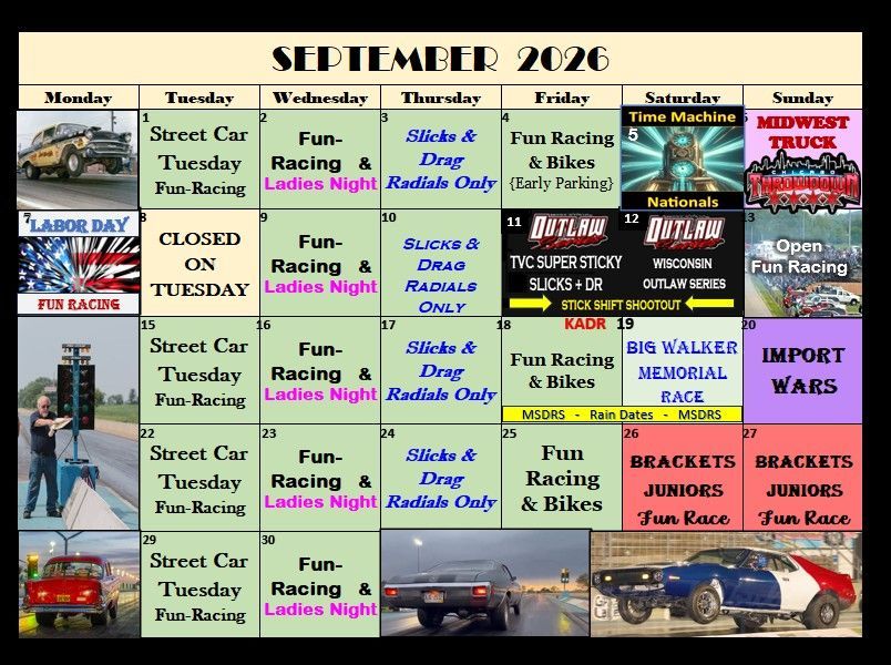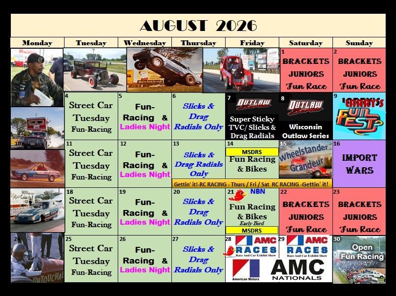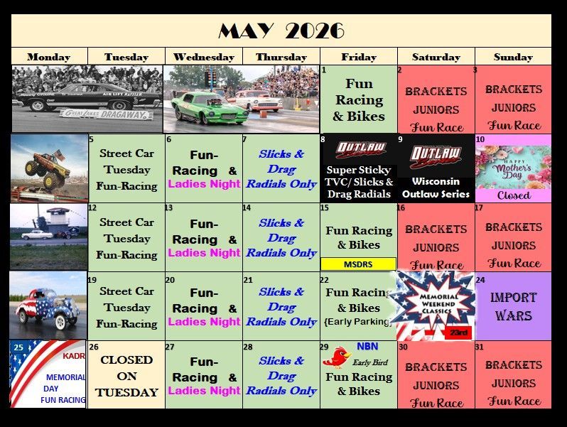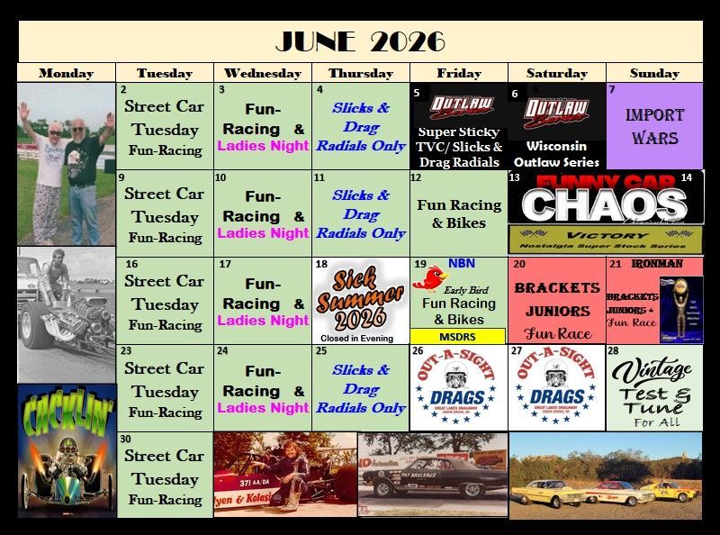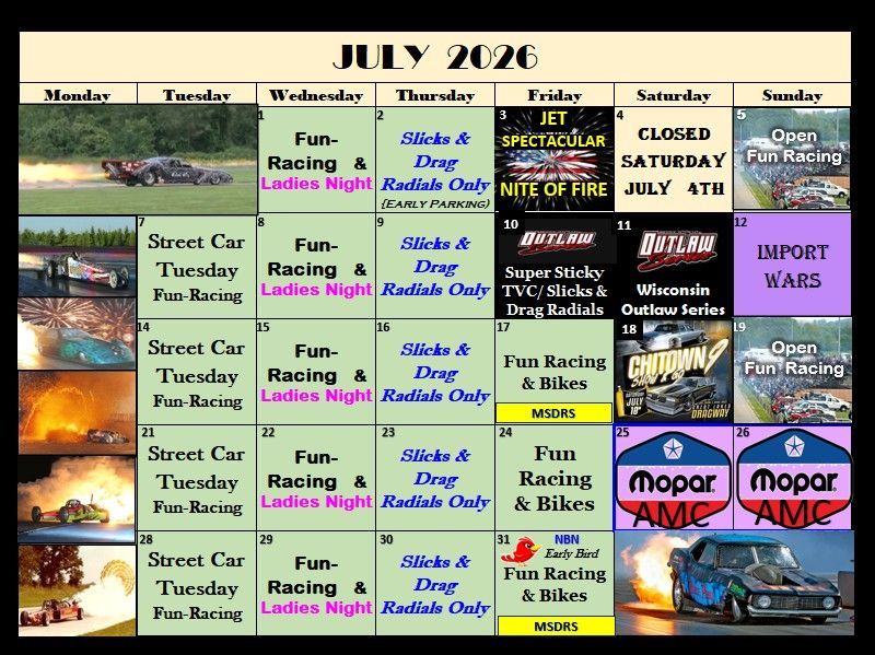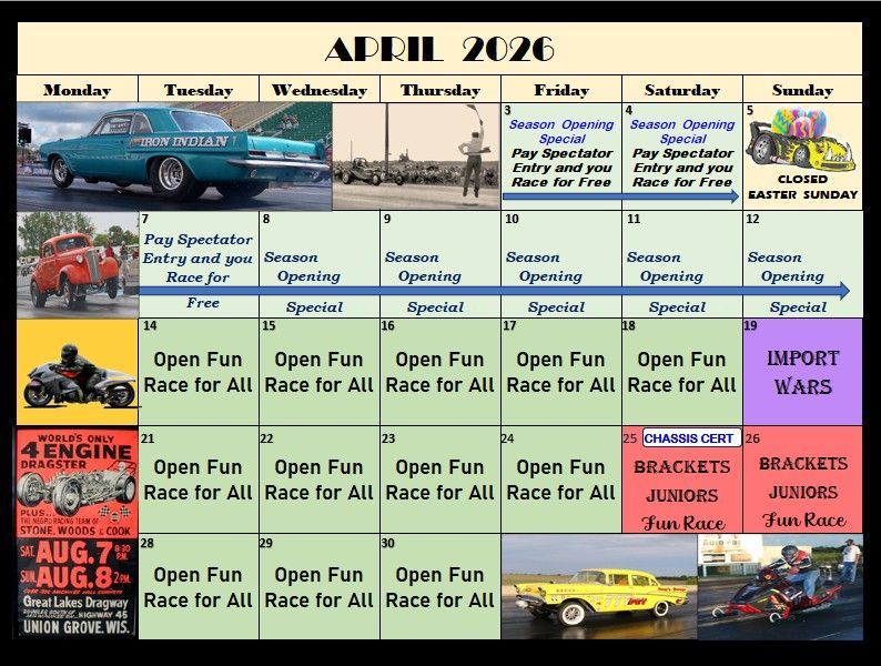 Great Lakes Dragaway has motorsport fun for the whole family. Stay up to date with our current calendar below. Bookmark this page and check back often for new scheduling information!
